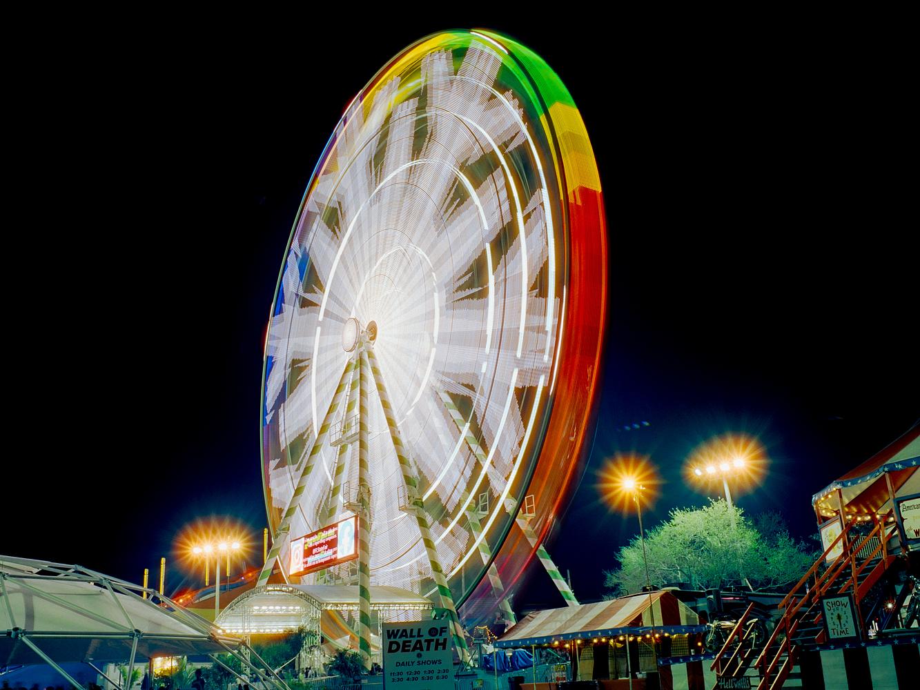 Long exposure of a Ferris wheel at a local fair. Shot on with a Bronica EC-TL with a 75mm lens CineStill 800T film.