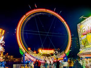 Long exposure of a small roller foster encased in a loop at the Florida State Fair. Shot on a Bronica EC-TL II medium format camera with a 75mm lens on CineStill 800T film.